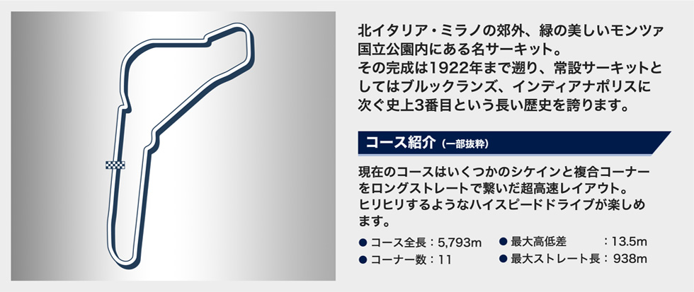 開幕戦のコースはイタリアの名サーキット「モンツァ」